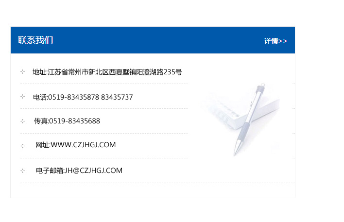 地址:常州市新北區友邦商務大廈1幢16、17層  電話:0519-85101652  傳真:0519-85112595  郵編:213022  網址:www.cz-jiayue_cn.whccmy.com  郵箱:xiajifengaa@163.com